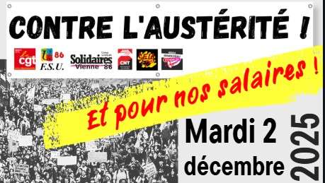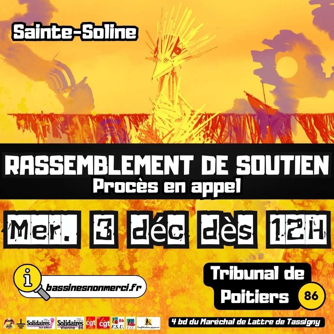 L'intersyndicale 86 (CGT 86, FSU 86 et Solidaires 86) appelle les Poitevins et les poitevines à se mobiliser le 3 décembre prochain et à rejoindre le rassemblement de soutien aux camarades inculpés dans le procès de l’organisation de la manifestation contre la méga-bassine de Sainte-Soline, à partir de 12h devant la cité judiciaire à Poitiers.